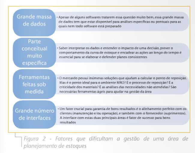Porém, o uso da ferramenta mais sofisticada, seja feita internamente ou comprada do mercado, não é garantia de resultados, ou de excelência na gestão desse tipo de material. Na área de planejamento de estoques de MRO existem outros fatores que contribuem para aumentar a complexidade da gestão desses materiais, e que não podem ser descartados, conforme descrito na Figura 2.